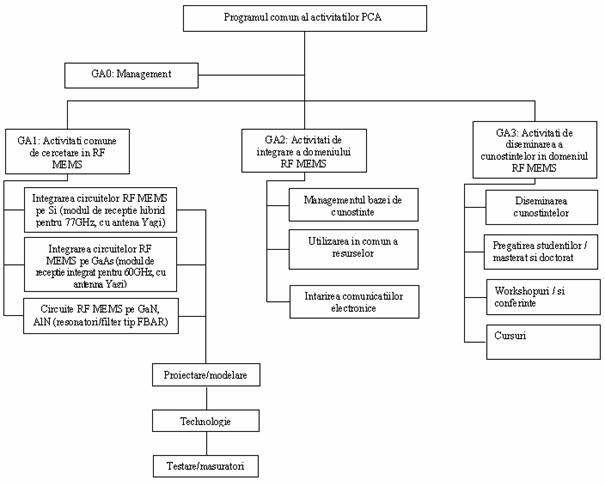 Aceste tinte vor fi atinse dezvoltind 3 grupuri de activitati (GA) prezentate in Fig.1. Primul grup de activiati (GA1) este dedicat cercetarii avansate, in comun, in cadrul consortiului, al doilea (GA2) este dedicat activitatilor de integrare in consortiu, al treilea (GA3) fiind dedicat diseminarii excelentei.