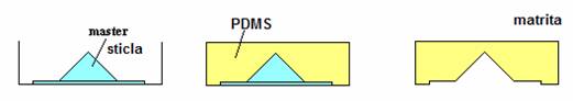 - Matrita se realizeazeaza intr-un cauciuc siliconic - PDMS (poli-dimetil-siloxane). Prepolimerul Sylgard 184 (Dow-Corning) se amesteca cu intaritorul in raport 10:1. Amestecul se degazeaza timp de 30 minute (pentru eliminarea bulelor de aer) intr-un desicator cuplat la o pompa de vid.