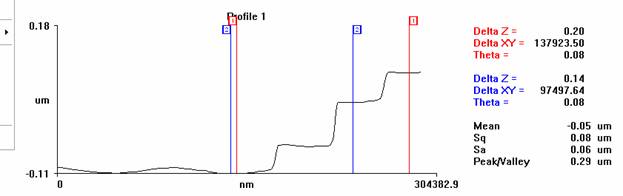 Pentru structurile cu 4 nivele profilometria optica (fig. 7) a indicat diferente intre doua nivelede aprox. ~ 70 nm nm si astfel nivelel sunt 0, 70 nm, 140 nm si 200 nm).