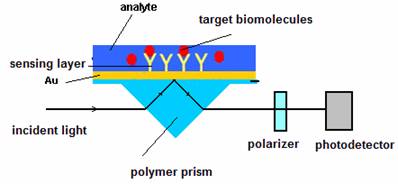 Chemo/biosensors based on Surface plasmon Resonance (SPR) have been experimented using polimeric microprisms obtained by replication of an original (glass prism). The prism base is covered by a gold layer and a senzitive layer- fig. 11.