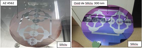 Sistemul de microcanale fabricat pe spatele plachetei de siliciu: (stânga) înainte de îndepărtarea fotorezistului AZ 4562; (dreapta) după îndepărtarea fotorezistului