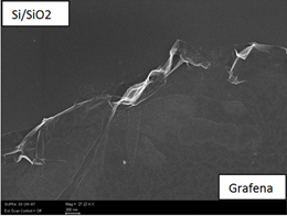 Pentru obținerea membranelor de grafenă, s-a transferat grafenă de pe folia de cupru pe substrat de Si/SiO2 structurat cu orificiile cu diametrul de 9 µm. În figura 2.7 sunt prezentate imagini SEM cu un strat monoatomic de grafenă transferat peste un orificiu de 9 µm.