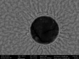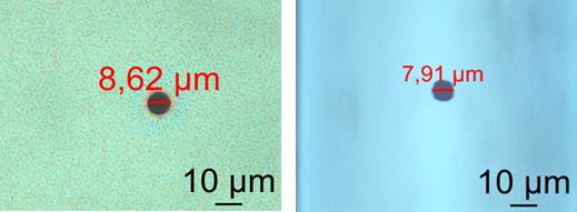 Nu am permis corodarea completă a stratului de oxid prin această metodă, deoarece în cazul acestui proces există tendința de corodare neuniformă a substratului de Si, care crește semnificativ rugozitatea. Ultimii 30 nm de oxid rămași au fost corodați în soluție BHF (NH3 : HF, 6:1), timp de 30 s. Corodarea substratului de siliciu pentru a obține orificiile s-a făcut în echipamentul de corodare cu plasmă cuplată inductiv (ICP – RIE), folosind un proces clasic de alternare a gazelor (proces Bosch). După corodarea siliciului, reziduurile de fotorezist de pe fața plachetei au fost îndepărtate în plasmă de oxigen, timp de 10 minute. În figurile 2.5 și 2.6 sunt prezentate imagini cu rezultatele obținute în urma fabricării orificiilor cu diametrul de 9 µm. Măsurătorile făcute pe imaginile optice arată diametrul de intrare de ~8,5 µm în timp ce diametrul de ieșire este de ~7,5 µm.