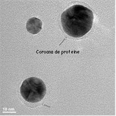 Imagini TEM ale AuNPs obtinute prin metode eco-fiendly si imersate in DMEM- coroana de proteine ce inconjoara AuNPs |