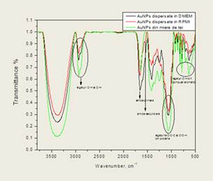Spectrele FT-IR ale AuNPs preparate si imersate in mediile de cultura celulara |
