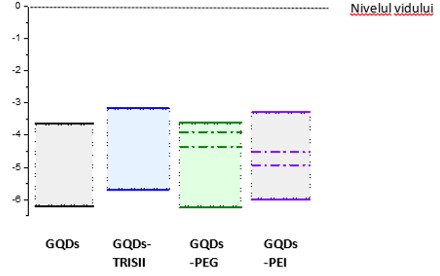 Astfel, s-au facut adaugat hidroclorura de D-(+)Glucozamina (GQDs-TrisII), polietilenglicol (GQDs-PEG) si respectiv polietilenimina (GQDs-PEI), obtinandu-se GQDs cu diametre de aproximativ 4-5 nm in toate cele 4 variante de sinteza, dar cu proprietati optice si electrice diferite. Pe baza masuratorilor electrochimice de voltametrie ciclica si analizelor optice (spectroscopie de fluorescenta si absorbtie UV-Vis) s-a realizat structura electronica de benzi a doturilor cuantice fabricate, asa cum se observa in Fig. 1: |