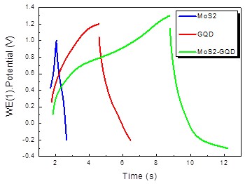 Importanta adaugarii monostraturilor de disulfurii de molibden (MoS2) in matricea polimerica poate fi observata in analiza comparativa a curbelor de incarcare-descarcare galvanostatica (GCD) inregistrate la curentul aplicat de 50 µA pentru structurile MSC cu si fara monolayere de MoS2.