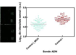 Se observă în cazul de față că incubarea mixului de ADN cu mecaptohexanol în soluție de imobilizare duce la o dispersare a valorilor de semnal, pe când în cazul incubării ADN control cu buffer de imobilizare, intensitățile de imobilizare date de replicile tehnice sunt mult mai uniforme. |