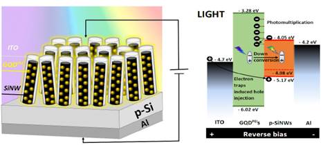 - The plasmonic Schottky optical detectors show an enhanced photocurrent, responsivity and external quantum efficiency (EQE) under zero bias conditions, attributed mainly to the increased photo-induced carrier injection and high electric field distribution surrounding the nanowires, as demonstrated by the simulation results.