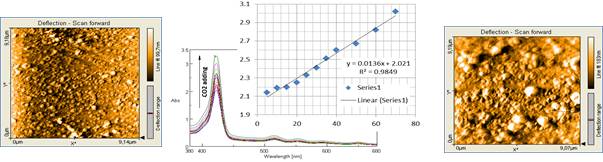 Figure 1. The increase and widening of the Soret band of (PyTDMeOPP) porphyrin function of increasing amounts of CO2. AFM ring aggregates after 15 minutes (left side) and filled after CO2 absorption (80 minutes).