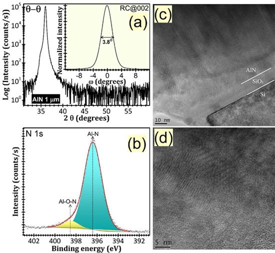 Figure 1: (a) Typical XRD diagram recorded in θ–θ symmetric geometry and the corresponding 002 rocking curve of the optimized AlN thin film. (b) N 1s core level XPS spectrum of the AlN film. Symbols represents the experimental data, the curves indicate the overall fit and identified components. (c,d) Cross-sectional TEM images of AlN thin film: general morphology (c); high-resolution micrograph (d). |