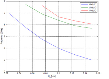 The resonance frequency of the first 3 modes, for different height of the electrodes He |