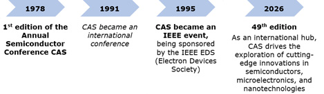 The CAS Conference has been organized in Romania yearly since 1978. The initial name was the Annual Semiconductor Conference (acronym CAS) and the first editions were organized by ICCE (Institute of Research for Electronic Components).
