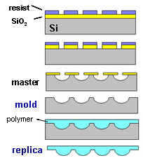 Development of replica molding techniques for replication of optical elements and microfluidic structures with feature size in the micron and submicron range.