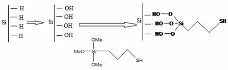 ■ REZULTATE ETAPA a 5-a, 21.07.2011 – 20.10.2011 1. Elaborarea tehnologiilor de fabricaţie a platformelor microfluidice **************************************************** 3. Dezvoltarea tehnicilor de auto-asamblare 3.A.1. Funcţionalizarea suprafeţelor – Raport experimentări Ca şi în cazul ataşării de compuşi ce conţin gruparea amină (NH2), şi în acest caz suprafaţa de Si/SiO2 se curăţă prin tratarea cu un amestec de H2O2:NH3:H20, apoi într-un amestec de etanol şi apă. Procedeul de silanizare constă în imersarea substratului ales într-o soluţie de mercaptopropiltrimetoxisilan (MPTS) în toluen. Initial, soluţia a fost barbotată cu azot, după care a fost ţinută un timp la o anumita temperatura fără barbotare. La finalul timpului de reacţie substratul a fost clătit în toluen, etanol şi apă deionizata şi uscat în atmosferă de azot, obţinându-se astfel pe suprafată grupări tiol (-SH).