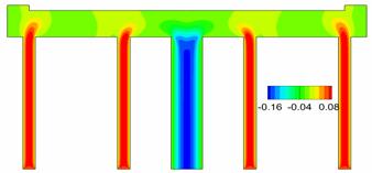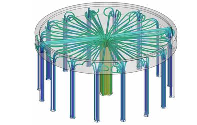 Reprezentarea liniilor de curent oferă o imagine clară a curgerii în interiorul camerei de reacţie. Astfel, se poate observa dezvoltarea curgerilor secundare ce duc la distribuţia neuniformă a gazului pe suprafaţa plachetei şi implicit o corodare neuniformă şi cu mari erori.