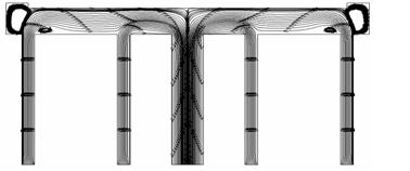 Atât reprezentarea 2D a liniilor de curent (într-un plan median) cât şi cea tridimensională pentru un număr Reynolds Re =10, prezintă uniformitatea distribuţiei gazului pe plachetă. (4). Concluzii Alegerea modelului optim pentru incinta reactorului de HF s-a realizat prin analiza hidrodinamicii fluidului în camera de reacţie, dar şi a distribuţiei efortului tangenţial pe plachetă. Astfel, distribuţiile de viteze ne indică o creştere a vitezei fluidului pentru geometria iniţială în zona orificiilor din apropierea fantei de evacuare. Acest lucru produce o neuniformizare a distribuţiei gazului pe placheta de siliciu, folosindu-se mult mai puţin din gazul inserat în incintă şi astfel scăzând randamentul procesului. |