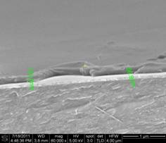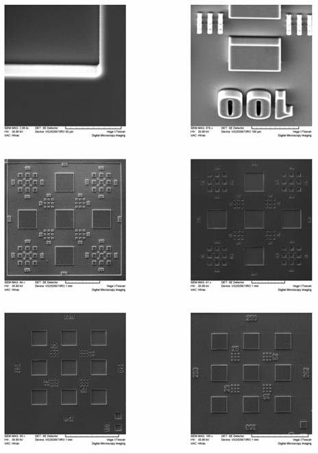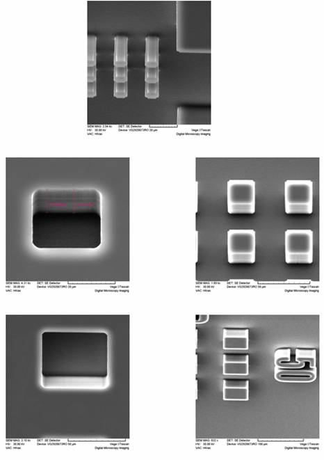Grosimile celor cinci bistraturi de polielectroliţi sunt destul de diferite, pentru regiunea măsurată atingând valoarea de 133,3 nm, ceea ce înseamnă că unui bistrat ii revine grosimea medie de 26,6 nm. Pentru a verifica morfologia şi modul de asamblare a nanotuburilor de carbon s-au captat imagini SEM şi după depunerea celor trei bistraturi CNT-PDADMA/PSS. Imaginile obtinute arată existenţa unui material compozit în care sunt dispersate nanotuburi de carbon.În ceea ce priveşte dispersarea nanotuburilor de carbon în polielectrolitul cationic şi apoi autoasamblarea pe substratul ITO depus pe suport de sticlă, imaginile SEM pentru (PDADMA/PSS)5-ITO şi (CNT-PDADMA/PSS)3, dovedesc obţinerea unor materiale compozite, care pot avea numeroase aplicaţii în domeniile nano- şi biotehnologiilor, precum şi ale chimiei supramoleculare, datorită rolului de transportor molecular pe care unii polimeri îl joacă pentru anumiţi compuşi organici şi anorganici. Faptul că s-a reuşit cu succes dispersarea CNT în soluţia de PDADMA şi s-au obţinut structuri multistratificate pe substratul ITO folosind tehnica layer-by-layer constituie un pas important pentru utilizarea acestora în aplicaţii cum sunt eliberarea controlată a medicamentelor sau obţinerea de noi materiale cu proprietăţi interesante. 1. Elaborarea tehnologiilor de fabricaţie a platformelor microfluidice 1.B.2. Experimentarea tehnologiei - Determinarea vitezei de corodare a siliciului în funcţie de condiţiile de proces – Studiu experimental pentru optimizarea variatiei vitezei de corodare uscata a siliciului in functie de conditiile de proces. Cercetarea experimentală se referă la corodarea anizotropă adâncă a siliciului pentru aplicaţii în microfluidică. După finalizarea procesării, plachetele au fost tăiate pentru a vedea profilul corodării şi pentru a măsura cât mai precis adâncimea corodată. Măsurătorile au fost făcute cu ajutorul microscopului cu baleiaj electronic (SEM). Pentru desfăşurarea experimentului au fost pregătite plachete de siliciu cu straturi de mascare diferite. Au fost testate plachete de siliciu <100> şi <100> puternic dopate epitaxial. A fost fabricată o mască test de corodare pentru verificarea vitezei de corodare. Au fost realizate mai multe probe folosind aceasta masca test, iar mai jos arătăm poze SEM ale câtorva dintre structurile realizate.