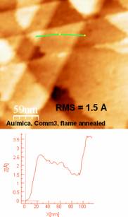 Caracterizare prin tehnici de difractometrie (XRD) Analiza prin difracţie de raze X (XRD) a probelor comerciale cât şi a celor obţinute în cadrul IMT s-a efectuat prin multiple tehnici. S-a urmărit identificarea unei metodologii semi-cantitative care să permită evaluarea rapidă şi eficientă a calităţii substratului depus (din punct de vedere al regularităţii cristaline), şi în acelaşi timp să genereze un ranking corelat cu rezultatele de examinare morfologică directă a suprafeţei prin tehnici de microscopie de baleiaj (STM, AFM). Scopul este de a obţine evaluări accelerate în vederea scurtării paşilor tehnologici de optimizare a procesului de depunere. S-a utilizat tehnica clasică de analiză a compoziţiei structurale prin spectrometrie theta-2-theta. Caracterizare prin microscopia de baleiaj Analiza prin microscopia de baleiaj cu efect tunel (STM) a fost realizată în modul topografic, obţinându-se informaţii asupra morfologiei suprafeţei de aur depuse pe mică. S-a evaluat gradul de rugozitate al interfeţei depunerii iniţiale, care a rezultat de 36 Å relativ la o arie de 1x1 μm. Rugozitatea interfeţei Au/sticlă (obţinută prin tehnica TSG) s-a dovedit a fi îmbunatăţită (8.5 Å, 1x1 μm), iar atunci când s-a aplicat şi un tratament termic („flame annealing”), în flacăra de propan- butan, s-a constatat o schimbare radicală a morfologiei suprafeţei (relevarea teraselor atomice şi a faţetelor tipice orientate după linii de 60o), suprafaţa caracterizată de o rugozitate medie (RMS) de 3.0 Å. În Figura 5 sunt exemplificate imaginea STM şi profilul de suprafaţă pentru interfaţa Au/sticlă după tratament termic în flacăra de propan butan obţinute pentru proba commercială de referinţă (Comm3-mică).