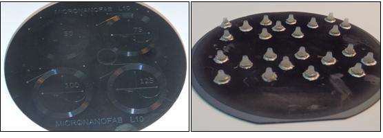 1.B.2.2. Functionalizarea suprafetelor de siliciu pentru a transforma caracterul lor din hidrofob in hidrofil Aceasta activitate a fost finalizata: Obiectivul principal al acestei activitati a fost investigarea experimentala a modificarii suprafetelor de SU8, PDMS, SiO2 si Si prin tratament in plasma RF. s-au experimentat metode de functionalizare a suprafetelor in plasma de diferite compozitii, presiuni si puteri RF diferite. Pentru fiecare proba functionalizata a fost determinata tensiunea superficiala (calitatea suprafetei) prin masurarea unghiului de contact pe care il face picatura de fluid cu supratata modificata controlat. Reactiile fizico – chimice la temperatura joasa pot fi folosite pentru functionalizarea suprafetelor tratate in plasma, prin modificarea unghiului de contact, polimerizare superficiala, sau prin inducerea unor regiuni hidrofile si/sau hidrofobe pe suprafata in contact cu plasma. Plasma de argon a fost folosita pentru a genera suprafete hidrofile, iar plasma de CF4 sau CF4 cu O2, CHF3, SF6, Ar, s-a folosit pentru crearea unor suprafete hidrofobe. A fost investigat efectul diversilor parametri ai plasmei (puterea RF, potentialul de electrod, debitul gazelor, compozitia plasmei, presiunea in reactor, timpul de expunere) asupra unghiului de contactal al apei pe suprafetele mentionate mai sus, asupra morfologiei suprafetei. S-a observat faptul ca plasma de O2 diminueaza drastic unghiul de contact, sub 200, iar plasmele pe baza de freon determina o crestere considerabila a unghiului de contact, peste 1100. De asemenea s-a observat ca unghiul de contact creste prin cresterea debitului de O2 adaugat plasmei de CF4. S-a observat ca unghiul de contact variaza foarte putin, la cresterea debitului de freon. Unghiul de contact creste drastic cu scaderea presiunii in reactor si cu cresterea puterii RF. O observatie foarte importanta este aceea ca funcţionalizarea PDMS-ului în plasmă este un proces reversibil. Unghiul de contact al apei cu PDMS-ul scade semnificativ în urma unui astfel de tratament, dar creşte dramatic după un anumit timp, şi revine la valoarea iniţială în câteva zile. Acest lucru a fost confirmat de experimentele realizate. În mod deloc surprinzător, plasma de SF6 şi O2 a avut cele mai bune rezultate, atât din punctul de vedere al scăderii unghiului de contact cât şi al stabilităţii pentru un timp cât mai lung. Radicalii de F şi O generaţi în această combinaţie acţionează atât asupra părţii organice a PDMS-ului cât şi asupra scheletului de siliciu. În urma acestui proces, suprafaţa PDMS-ului devine mai rugoasă crescând astfel aria totală pe care se ataşează grupări –OH. Reţetele au fost testate în cadrul altor experimente şi am constat reproductibilitatea rezultatelor de funcţionalizare. Variaţii minore de la aceste rezultate pot să apară datorită curăţeniei suprafeţei PDMS-ului. În cazul în care suprafaţa prezintă urme de praf sau alte impurităţi, poate fi spălată în alcool isopropilic şi deshidratată înainte de efectuarea tratamentului în plasmă. 1.B.2.3. Caracterizarea suprafetelor si optimizarea parametrilor de process Corodarea cu ioni reactivi (RIE) este o tehnică de corodare fizico-chimică, care îmbină reactivitatea cu bombardamentul ionic, putându-se obţine corodări selective şi direcţionate (anizotrope). Bombardamentul cu ioni poate să: (1) producă o rupere a legăturilor chimice slabe, (2) producă defecte care măresc reactivitatea chimică, (3) asigure energia de reacţie, (4) îndepărteze straturile acoperitoare (reziduuri de corodare şi polimeri) care inhibă corodarea. Defectele produse de bombardamentul cu ioni pot fi defecte intrinseci de legătură sau specii de corodare şi impuritaţi implantate. În acord cu convenţia pentru notaţii adoptată în raportul precedent, se va nota stratul de defecte intrinseci de legătură cu (D), iar stratul de impurităţi implantate cu (P). Speciile de corodare introduse în stratul (P) în timpul corodării se datorează diferitelor combinaţii de implantare: implantare canalizată, implantare de recul, implantare asistată de difuzie prin centrele de densităţi de defecte de neechilibru. În unele situaţii, stratul (P) işi poate avea originea în procesul de redepunere. Pentru energiile cinetice ale ionilor luaţi în consideraţie la corodarea uscată (de la zeci de eV la aproximativ 1000eV), grosimea stratului (P) poate varia de la zeci de Ĺ la câteva sute de Ĺ . Stratul (P) este prezent atât în corodarea fizico-chimică, cât şi în corodarea fizică. Stratul (D) conţine: vacanţe (defecte Frankel), interstiţiali şi dislocaţii. Acesta se poate suprapune peste stratul (P), sau se poate întinde dincolo de acesta. Stratul (D) este deasemenea prezent atât în cazul corodării fizico-chimice (RIE), cât şi în cazul corodării fizice (sputtering). Dacă materialul de corodat este un compus chimic, atunci au loc schimbări în stoichiometria stratului (D). Implicaţiile asupra proprietăţilor electrice ale stratului (D) se văd în variatia barierei Schottky pentru Si-n şi Si-p. S-a observat că, pentru oricare gaz de corodare folosit la corodarea uscată, se micşorează înălţimea barierei contactului metal/semiconductor pentru Si-n şi se măreşte pentru Si-p. Se presupune că acest efect se datorează sarcinii pozitive asociate cu stratul (D). Sarcina pozitivă poate fi prezentă şi în stratul (P), sub forma de : H+, Ar+, N+, O+, CF3+. Atât stratul de defecte (P), căt şi stratul de defecte (D) pot fi uşor îndepărtate prin tratamente termice adecvat. Rezultatele experimentale indica faptul ca rugozitatea suprafetei corodate depinde in principal de trei factori: adancimea corodarii (rugozitatea creste cu cresterea adancimii de corodare), gazele de corodare si potentialul de electrod care este dat de puterea RF si presiunea in reactor. În corodarea uscata tip RIE, plasma RF se utilizează pen