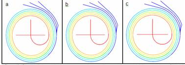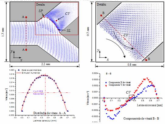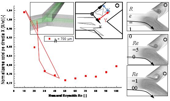 Fluidul de test utilizat prezintă caracteristicile de material ale apei, cu o viscozitate dinamica η ≈ 10-3Pas. Particule de aur au fost injectate numeric la intersectia celor 3 microcanale de intrare pentru a simula formarea lipozomilor. Debitele de intrare au fost variate pentru a controla grosimea fasciculului principal de curgere, ce ar cuprinde lipozomii auto-asamblati, si astfel pentru a controla dimensiunile acestora din urma. Figurile 2 si 3 prezintă câteva rezultate ale acestui studiu. Variatiile presiunilor sunt foarte mici din punct de vedere al distributiei pe întreg domeniul de curgere, doar valorile nominale ale acestora înregistrează variatii notabile. Distributiile de viteze surprind in zona de jonctiune corelatia dintre variatiile introduse in debitele de intrare si diferentele înregistrate intre vitezele de intrare.