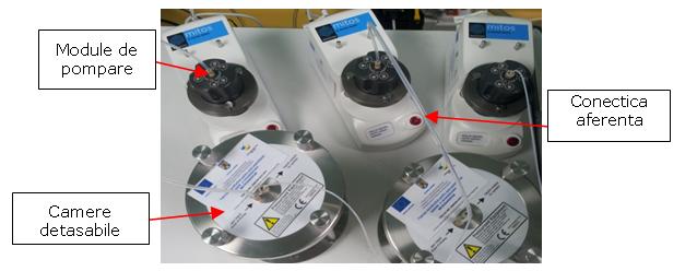 Sistemul µPIV este folosit în cadrul lucrării pentru: (i) reprezentarea profilurilor de viteză într-o curgere total dezvoltată (curgerea principală) şi (ii) identificarea locaţiei centrului vârtejului (CV), punctului de stagnare (SP) sau a liniei de separare dintre curgerea principală şi cea secundară (SL). Aceste informaţii de interes sunt obţinute succesiv, printr-o controlare făcută asupra timpului Activitatea 2.B - Setarea hardware a sistemelor de pompare si comanda pentru canale microfluidice Proiect preliminar software dedicat controlului elementelor microfluidice (pompe, valve, etc) Sistemul achizitionat in cadrul proiectului este folosit pentru impunerea unui debit constant de fluid în interiorul microcanalelor - conditie esentială pentru realizarea experimentelor în conditii de curgere permanentă. El are în componentă trei module de pompare (pompe cu perna de aer) care sunt conectate la un calculator pentru a oferii posibilitatea unei functionari si a unei manipulări concomitente a celor trei module. Introducerea fluidelor în dispozitivele microfluidice se va realizeaza pe una sau mai multe intrari aflate la o distantă semnificativ de mare astfel să fie asigurată o curgere total dezvoltată în zonele de interes. Crearea formatiunilor lipidice prin metoda îngustări hidrodinamice (hydrodynamic focusing) presupune crearea unei presiuni ce trebuie mentinută constantă în zona de bifurcatie, presiune care este controlată cu ajutorul sistemului achizitionat. Pentru un control mult mai precis al debitelor (respectiv a presiunii) se va dezvolta un soft special pentru întreg sistemul de pompare. Cu ajutorul acestuia debitele de pompare vor putea fi mentinute atat constante cat si pulsatorii sau sinusoidale. Cu ajutorul sistemului µPIV (achizitionat de asemenea in cadrul proiectului) o calibrarea si o verificare a sistemului de pompe poate fi realizată. Timpul de răspuns al pompelor cu perna de aer, la schimbări ale debitului respectiv din pozitia pornit/oprit, este mult mai mic, acest lucru fiind esential pentru realizarea de vizualizări/măsurători cantitative într-un regim stationar de curgere. Arhitectura sistemului de pompare este alcatuita din: