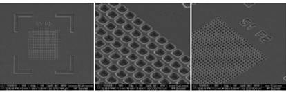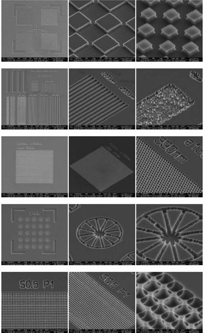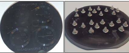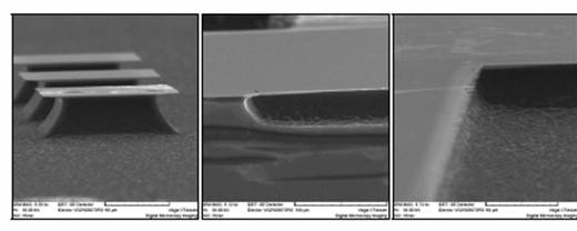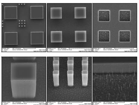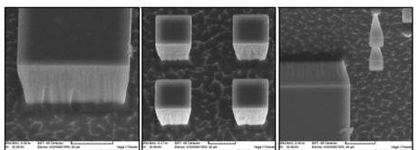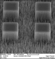 1. Elaborarea tehnologiilor de fabricaţie a platformelor microfluidice Activitatea: 1.B.3. Validarea tehnologiei pe structuri test 2. „Designul, simularea, alegerea sistemului optim, setarea hardware pentru asambarea nanstructurala in canale microfluidice”: Activitatea 2.B -Setarea hardware a sistemelor de pompare si comanda pentru canale microfluidice Activitatea 2.C - Studiul diverselor metode de asamblare nanostructurala: camp magnetic, camp electric, actionare hidrodinamica **************************************************** Elaborarea tehnologiilor de fabricaţie a platformelor microfluidice Activitatea: 1.B.3. Validarea tehnologiei pe structuri test Fabricarea dispozitivilui. Tehnica de corodare adâncă cu ioni reactivi (DRIE) a fost prezentată prima dată în anii ’90 şi a revoluţionat fabricarea microsistemelor. Această tehnică a pus bazele fabricării dispozitivelor Micro-Electro-Mecanice (MEMS). Corodarea siliciului în DRIE este independentă de structura cristalină, facând posibilă corodarea unor geometrii inaccesibile în soluţii umede de corodare anizotropa (KOH, TMAH, EDP), care sunt limitate de anumite plane cristaline. În microfluidică această libertate a permis fabricarea unor microcanale noi, cu profile unice de curgere: canale îngustate, radiale, meandre sau spirale. DRIE este esenţial pentru fabricarea unor dispozitive cu dimensiuni reduse. Este capabil să reproducă cu acurateţe aproape orice geometrie obţinută cu ajutorul fotolitografiei. Studiile legate de dinamica fluidelor necesită DRIE pentru a fabrica cu acurateţe microcanale şi orificii sau chiar membrane. DRIE permite fabricarea unor structuri cu raport dimensional mare. Astfel se pot fabrica piloni, orificii sau microcanale cu raport dimensional de 10:1 până la 20:1, în cazuri speciale fiind raportate rapoarte de până la 40:1 sau chiar mai mari. Procedura de lucru. Pentru determinarea vitezei şi profilului de corodare, mai multe plachete de siliciu au fost mascate cu fotorezist sau oxid, şi s-au făcut probe la presiuni diferite şi timpi de pasivare/ corodare diferiti. Probele au fost procesate una câte una, echipamentul nepermiţând procesarea mai multor plachete în acelaşi timp. După finalizarea procesării, plachetele au fost tăiate pentru a vedea profilul corodării şi pentru a măsura cât mai precis adâncimea corodată. Măsurătorile au fost făcute cu ajutorul microscopului cu baleiaj electronic (SEM). Pe toate plachetele a fost aplicată o mască test, special concepută pentru testarea corodărilor adânci în DRIE. Desfăşurarea experimentului. Pentru desfăşurarea experimentului au fost pregătite plachete de siliciu cu straturi de mascare diferite. Au fost testate plachete de siliciu <100>. Pregătirea plachetelor. Proba 1: