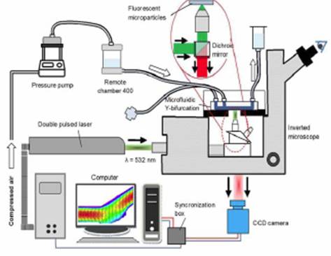 Debite constante de curgere au fost introduse şi menţinute constante cu ajutorul sistemului de pompare microfluidic (Mitos P-Pump, Dolomite, Charlestown, MA) conectat la sistemul de aer comprimat al laboratorului. Sistemul de pompare utilizat pe baza de aer comprimat asigura un debit constant în interiorul canalului, precum si o curgere lipsita de pulsatii. Debitul a fost măsurat la ieşirea din microcanal cu metoda volumetrică, aceasta fiind o procedură clasică de măsurare a debitului. Tehnica de masurare Micro-PIV Deoarece dispozitivele microfluidice folosite sunt realizate din materiale transparente, iluminarea în volum a acestora s-a putut realiza de jos cu un laser cu dubla cavitatie care genereaza o lumină monocromă Nd:YAG (NewWave Research, Fremont, CA). Laser-ul emite două pulsuri de lumină în lungimea de unda λ = 532 nm. Durata unui puls este de ordinul a 10 ns, iar timpul între doua pulsuri consecutive de lumina poate varia în cadrul masuratori prezentate de la 40 nanosecunde la o secunda. Fascicului de lumină este transferat catre un microscop optic inversat. Conexiunea optică dintre microscop şi laser este realizată cu ajutorul unei fibre optice.