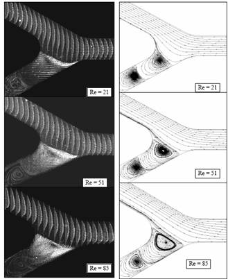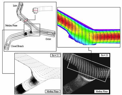 Sistemul Micro-PIV este folosit în cazul primei aplicaţii pentru următoarele analize: (i) reprezentarea profilurilor de viteză într-o curgere complet dezvoltată (în zona curgerii principale) şi (ii) identificarea poziţiei centrului vârtejului format în ramura blocată, într-o curgere staţionară.