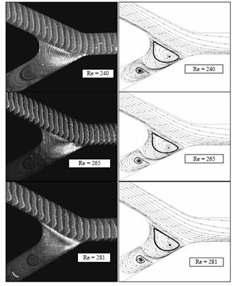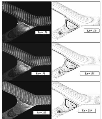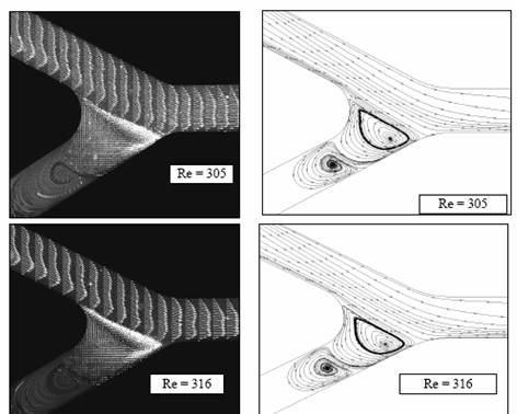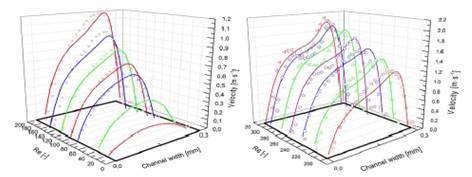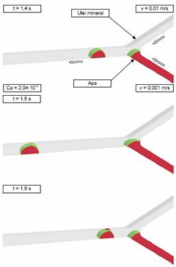 Pentru a reprezenta evoluţia vitezei în regiunea amonte bifurcaţiei pe ramura deschisa la adâncimea corespunzătoare planului median (în cazul bifurcaţiei-Y), profilurile de viteză pentru fluidul de lucru au fost cuantificate sub forma unor reprezentări grafice, acestea fiind obţinute atât experimental cât şi numeric pentru diferite debite de curgere. Analizarea comportamentului hidrodinamic a fost realizata pentru cazul fluidului newtonian, iar rezultate obtinute sunt prezentate în figura de mai jos. Măsurătorile au fost efectuate la diferite căderi de presiune impuse cu ajutorul pompelor microfluidice, ceea ce corespunde unor numere Re cuprinse între 21 şi 316 (a se vedea figurile de mai jos). Din rezultatele experimentale obtinute este evidentă o răspândire mult mai rară a punctelor ce definesc profilurile de viteză pentru debitele mai mari. Pentru debitele mici, algoritmul de generare al profilurilor bi-dimensionale de viteză folosesc imagini divizate în arii de interogare (de calcul) de 32 x 32 pixeli, iar odată cu cresterea debitului profilurile de viteză se obţin numai dacă imaginile sunt împărţite în zone de interogare cu ariile de 64 x 64 pixeli. Acest procedeu de măsurare are un efect important asupra numărului vectorilor de viteză identificaţi experimental şi implicit asupra reprezentărilor grafice ale vitezei. O primă concluzie poate fi luată cu privire la gradul de consistenţă calitativă şi cantitativă dintre numeric şi experimental, unde rezultate corespunzătoare fiind obşinute numai pentru numere Re mai mici de 200. Studiul de fata prezinta comportamentul a doua fluide imiscibile intr-o bifurcatie in forma de “Y” cu doua intrari si o iesire. Figurile de mai jos, prezinta o investigatie cu privire la dinamica formei interfetei ce se manifesta la diferite numerele ale capilaritatii (Ca), prin variatia rapoartelor debitelor pe cele doua intrari.