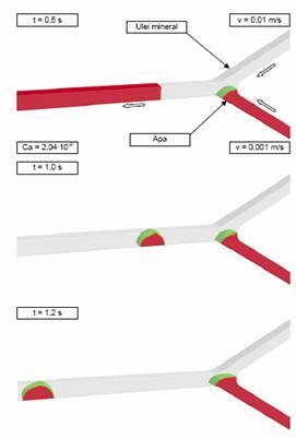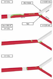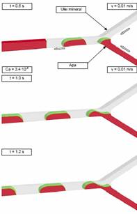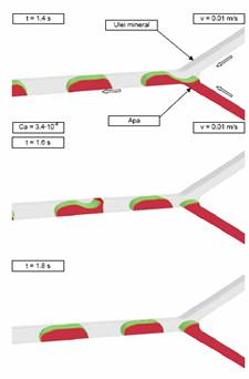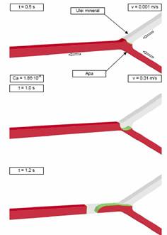 Fluidele imiscibile utilizate pentru acest studiu sunt doua fluide Newtoniene bine cunoscute si caracterizate: ulei mineral si apa deionizata, fiecare fiind introdus separat pe ramurile de intrare ale bifurcatiei in Y. Un aspect foarte important al caracterizarii din punct de vedere al proprietatilor fizice ale fluidelor de lucru il reprezinta tensiunea intefaciala. Valoarea acesteia a fost masurata cu un aparat numit goniometru si implementata in modelul numeric. Investigatia releva faptul ca variatia Ca are un impact important asupra frecventei de formare a picaturilor. Prin simpla modificare a raportului debitelor de intrare, comportamentul picaturilor se modifica drastic. Predictia si reconstructia numerica a formei interfetei dintre cele doua fluide imiscibile conduce la o caracterizare mai ampla a fenomenului formarii de picaturi sau vezicule cu comportament asemanator. |