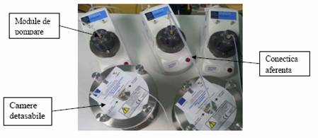 2. „Designul, simularea, alegerea sistemului optim, setarea hardware pentru asambarea nanstructurala in canale microfluidice”: Activitatea 2.B -Setarea hardware a sistemelor de pompare si comanda pentru canale microfluidice Sistemul achizitionat in cadrul proiectului este folosit pentru impunerea unui debit constant de fluid în interiorul microcanalelor - conditie esentială pentru realizarea experimentelor în conditii de curgere permanentă. El are în componentă trei module de pompare (pompe cu perna de aer) care sunt conectate la un calculator pentru a oferii posibilitatea unei functionari si a unei manipulări concomitente a celor trei module. Introducerea fluidelor în dispozitivele microfluidice se va realizeaza pe una sau mai multe intrari aflate la o distantă semnificativ de mare astfel să fie asigurată o curgere total dezvoltată în zonele de interes. Crearea formatiunilor lipidice prin metoda îngustări hidrodinamice (hydrodynamic focusing) presupune crearea unei presiuni ce trebuie mentinută constantă în zona de bifurcatie, presiune care este controlată cu ajutorul sistemului achizitionat. Pentru un control mult mai precis al debitelor (respectiv a presiunii) se va dezvolta un soft special pentru întreg sistemul de pompare. Cu ajutorul acestuia debitele de pompare vor putea fi mentinute atat constante cat si pulsatorii sau sinusoidale. Cu ajutorul sistemului µPIV (achizitionat de asemenea in cadrul proiectului) o calibrarea si o verificare a sistemului de pompe poate fi realizată. Timpul de răspuns al pompelor cu perna de aer, la schimbări ale debitului respectiv din pozitia pornit/oprit, este mult mai mic, acest lucru fiind esential pentru realizarea de vizualizări/măsurători cantitative într-un regim stationar de curgere. Arhitectura sistemului de pompare este alcatuita din: (1) Module de pompare care asigura undebit constant; (2) Camere detasabile folosite in cazul unei cantitati mari de fluide de lucru; (3) Conectori si tubulatură aferenta.