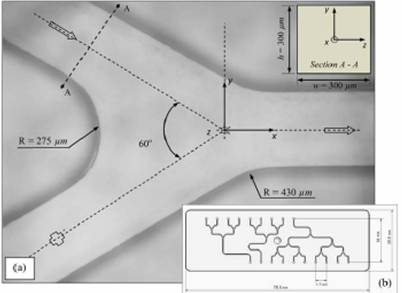 Dispozitiv microfluidic pentru auto-asamblarea si separarea lipozomilor. Microcanalele sunt fabricate in plachete de siliciu (cu diamerul 100 mm – 4 in, grosime 525-550 µm achizitionate de la Semiconductors Wafer, Inc. Hsinchu, Taiwan) cu ajutorul tehnologiei de prelucrare deep reactive ion etching (DRIE - Oxford Plasmalab System 100-1) - tehnologie de prelucrare uscata in plasma - folosind procesul Bosch. Designul zonei de testare microfluidica trebuie proiectat cu cel putin un perete transparent, astfel încat curgerea sa fie vizualizata cu ajutorul obiectivelor unui microscop inversat. Din acest motiv s-a ales sigilarea circuitelor microfluidice cu ajutorul unui perete transparent reprezentat de o placheta de sticla borsilicata (diametrul de 100 mm, grosime 0.7 mm, Pyrex 7740). Accesul fluidic se realizeaza cu ajutorul gaurilor strapunse cu diametrul de 1 mm de pe spatele plachetei de siliciu, prelucrate prin aceeasi tehnologie DRIE la fiecare capat terminus al microcanalelor. Pe o placheta de siliciu patru dispozitive microfluidice sunt prelucrate, fiecare avand aceeasi adancime si configuratie generala (de 100 µm), dar cu diferite valori ale latimi de microcanal (50 µm, 75 µm, 100 µm, si 125 µm). Dupa prelucrarea DRIE placheta de siliciu a fost sudata anodic (anodic bonding) cu o placheta de sticla pentru sigilarea microcanalelor (temperatura de sudare 400° C la o diferenta de potential de 1200V). Tuburi fluidice din politetrafluorulin (PTEE) au fost atasate la punctele de acces fluidice cu ajutorul porturilor fluidice comerciale disponibile. Porturile fluidice au fost lipite pe statele plachetei de siliciu cu ajutorul unei paste polimerice. In testele preliminare tuburile capilare (achizitionate de la Dolomite, Charlestown, MA), au un diametru interior de 0.5 mm si asigura legatura cu camerele detasabile (Remote Chamber 400 and 30, Dolomite, Charlestown, MA) care contin fluidele de testare. Un debit constant de fluid si lipsit de pulsatii a fost mentinut cu un mecanism de pompare pe baza de perna de aer (Mitos P-Pump, Dolomite, Charlestown, MA) conectat la portul de aer comprimat al laboratorului.