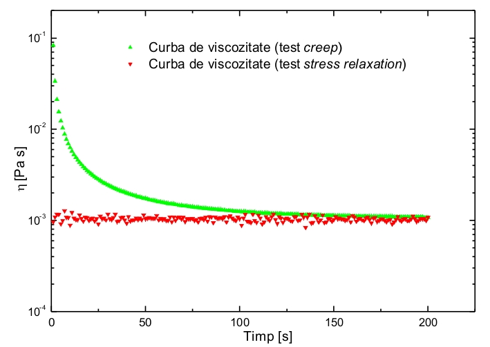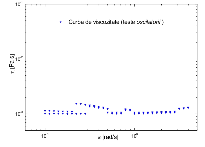 Testele creep, test de tip shear stress (componenta tensiunii interne este coplanară cu secţiunea transversală în material) au fost realizate prin impunerea unei tensiuni de forfecate constantă (t = 1Pa) (a se vedea Fig. 2.6 a) din care se observă curba de viscozitate cum tinde către o valoare de h = 10-2 Pa×s. În testele de relaxare a tensiunilor interne, teste de tip shear rate (viteza de forfecare între două plane paralele ale materialului lipidic), în care au fost impuse viteze de forfecare constante, se poate observa comportamentul pur Newtonian al soluției de lipozomi. Acelaşi lucru este înregistrat şi în cazul testelor oscilatorii (Fig. 2.6 b), fapt ce ajută la a decide asupra tratării soluției de lipozomi ca fluid Newtonian încărcat cu nanoparticule. Testele reologice se dovedesc a fi folositoare din perspectiva realizării unei simulări numerice cu privire la o curgere fluidică într-o geometrie dată, prin alegerea corectă a modelului de fluid simulat. Astfel în simulările numerice alegerea unui fluid Newtonian cu proprietățile apei este justificată.