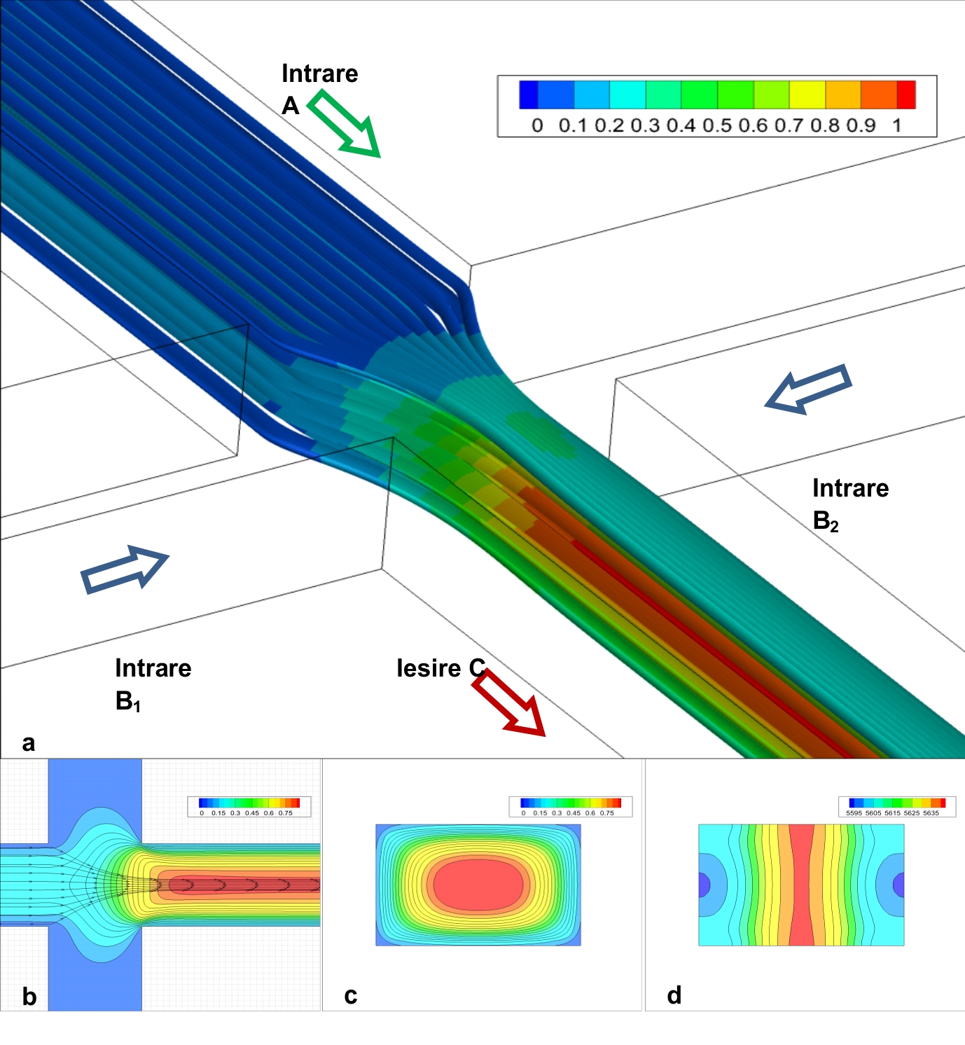 Simulările numerice au fost realizate pe o geometrie de tip cruce cu 3 intrări (una principala si doua secundare) si o ieşire cu o secţiune de 60x40 μm. Acestea reprezintă variații ale focusării hidrodinamice, metoda folosita pentru obținerea si controlul dimensiunilor lipozomilor. In acest caz, s-a utilizat un raport al debitelor de 4:1 (B1+B2/A). Studiul auto-asamblării prin litografie coloidală Litografia coloidală (LC) utilizează matrici/structuri bidimensionale (2D) ca măşti pentru corodare sau depunere prin sputtering. Avantajele LC sunt următoarele: in primul rând, din punct de vedere al costului de producţie, LC este un proces rentabil în fabricarea de structuri funcţionale la scară nano; şi asta pentru că LC foloseşte o cantitate mică de dispersii coloidale în creearea de matrici coloidale regulate, iar dispersiile coloidale sunt disponibile la un cost relativ mic; in plus, nu este nevoie de un echipament complex pentru fabricarea de tipare de câţiva zeci de nm. In al doilea rând, LC este un proces simplu pentru ca fabricarea de şabloane de auto-asamblare, care se realizează fie prin imersie, fie prin centrifugare. In al treilea rând, dimensiunea caracteristică in LC este controlată de dimensiunea particulei coloidale prin tratamente termice (recoacere) sau depunere sub un unghi. In al patrulea rând, prin LC se pot creea structuri mai complexe 3D, ca de exmplu materiale cu nanopori funcţionali, capace metalice hemisferice şi coloizi sculptaţi. In al cincilea rând LC se poate folosi în creearea de tipare în bio-materiale pentru fabricarea de bio-senzori şi bio-chipuri. In general, suprafeţele particulelor coloidale pot fi modificate cu bio-linkers, ca de exemplu acid carboxilic sau grupări amină. Tehnica litografică care constă în implantarea unor centri activi de polimerizare, aşa numita seed polymerization poate fi folosită în sinteza microsferelor polimerice monodisperse cu diametru mai mare de 1 mm. După sinteza particulelor care vor reprezenta centrii de polimerizare, au loc polimerizări adiţionale repetate pe reţelele polimerului iniţial, obţinând astfel sfere de polimerice mai mari. Totusi, din cauza adaugarii repetate de materie primă, distribuţia dimensiunii sferelor polimerice se lărgeşte. O polimerizare în dispersie într-un singur pas se foloseşte ca metodă alternativă pentru îmbunătăţirea uniformităţii dimensionale în producerea de particule mai mari de 1 micron în diametru. In cazul polimerizării în dispersie, locul de reacţie este picătura de monomer stabilizată de o cantitate mică de surfactant şi iniţiator, care este solubil în ulei şi difusează în picătura de monomer. Prin urmare, fiecare picătură de monomer acţionează ca un reactor de polimerizare în volum. Microsferele de PS si PMMA pot fi sintetizate in solvenţi polari sau ne-polari, iar caracteristicile de suprafaţă şi densitatea de crosslink-uri sunt controlate prin copolimerizare. Pentru particule monodispersate, cele două procese trebuie separate aşa încât nucleii să poată fi generaţi în mod omogen fără creştere simultană. Distribuţia dimensiunii particulelor devine din ce în ce mai îngusta în timpul reacţiei. In general, dimensinea şi polidispersia particulelor depind de mulţi factori cum ar fi valoarea pH-ului, concentraţia de catalizator, compoziţia reactivilor, tipul solvenţilor, şi temperatura de reacţie; toţi aceşti factori afectează viteza de hidroliză şi condensaţia. Dimensiuni de 200-600nm a particulelor monodisperse de bioxid de siliciu au fost obţinute prin modificarea parametrilor susmenţionaţi. Particule de bioxid de siliciu pot fi dispersate în solvenţi organici prin schimbarea proprietăţilor de suprafaţă cu agenţi de cuplare cu silan, ca de exemplu OTMOS. Grupul hidrofilic silanol (-Si-OH) de pe suprafaţa particulei de bioxid de siliciu poate fi modificat pentru a face particula hidrofobă.