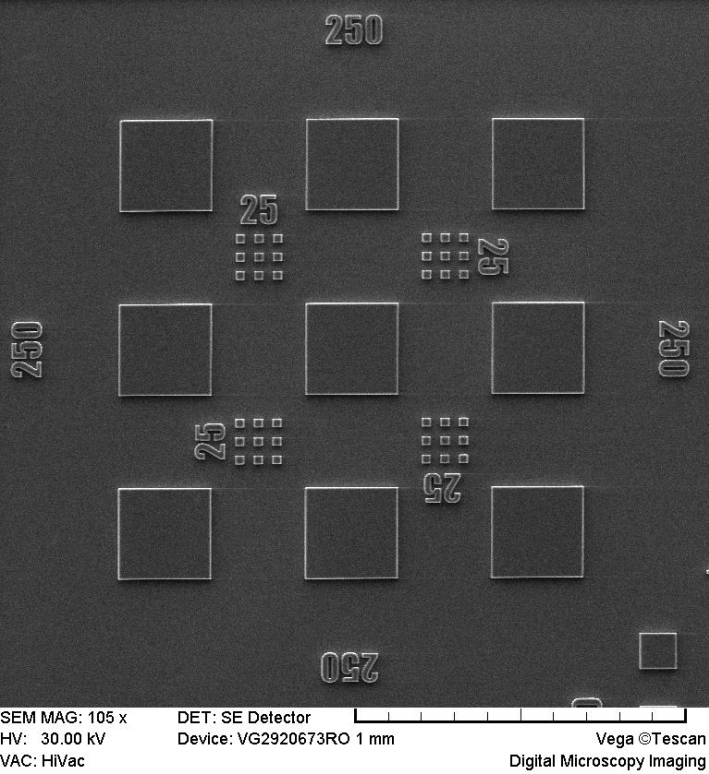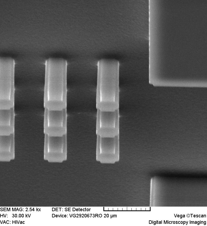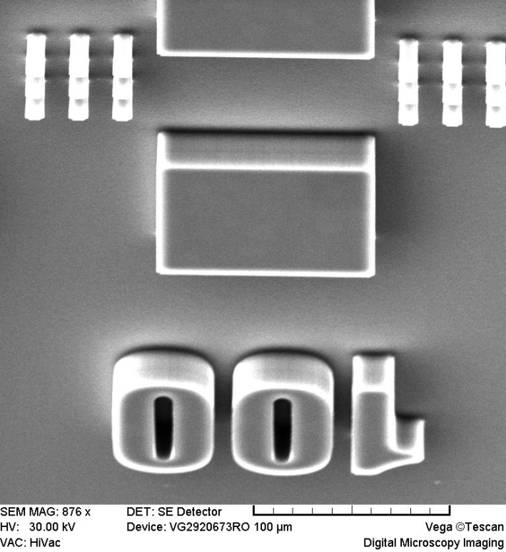 Corodarea a fost uniformă. Pereţii verticali prezintă o uşoară rugozitate. În imaginile înregistrate se poate observa apariţia unei curburi a peretelui vertical. Aceasta se datorează diferenţei mari dintre timpul de pasivare şi timpul de corodare, astfel apare tendinţa de corodare a siliciului pe sub masca de oxid, stradul de SiO2 rămânând suspendat.