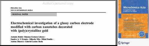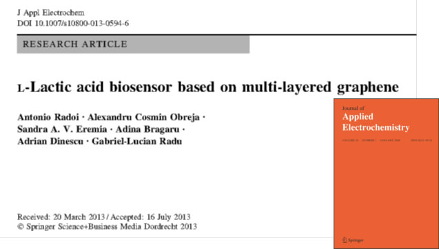 “L-lactic acid biosensor based on multi-layered graphene”, Antonio Radoi, Alexandru Cosmin Obreja, Sandra A. V. Eremia, Adina Bragaru, Adrian Dinescu, Gabriel-Lucian Radu. Journal of Applied Electrochemistry, ISSN: 0021-891X.