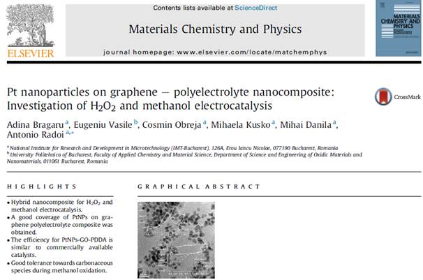 “Pt nanoparticles on graphene - Polyelectrolyte nanocomposite: Investigation of H2O2 and methanol electrocatalysis", Bragaru, A., Vasile, E., Obreja, C., Kusko, M., Danila, M., Radoi, A., Materials Chemistry and Physics, 146 (3), pp. 538-544.