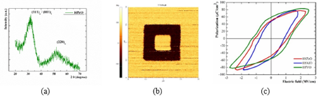 Figure 1. (a) GIXRD) spectra of the ~7-nm-thick HfYO; (b) PFM phase images of the HfAlO thin film; (c) polarization curves of capacitors with doped HfO2 for different dopants. |