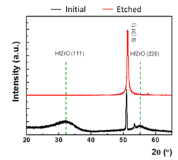 Figure 2. XRD Spectra obtained before (black) and after (red) the etching of HfZrO ultra-thin film |