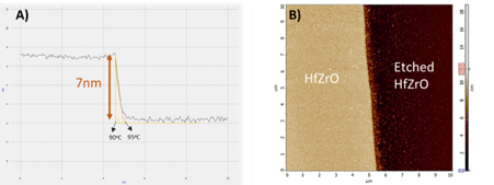 Figure 3. AFM A) profile and B) image at the edge between the non-etched and etched HfZrO areas. |