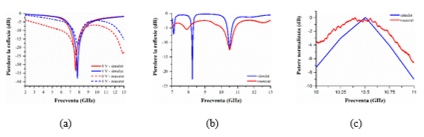 Figure 7. (a) Comparison between EM simulations and microwave measurements of the bandpass filter, in terms of reflection coefficient, for two values of the DC bias voltage; comparison between simululated and measured results for the (b) reflection coefficient and (c) normalized power (in the 10-11 GHz band) of the meta-atom based patch antenna. |