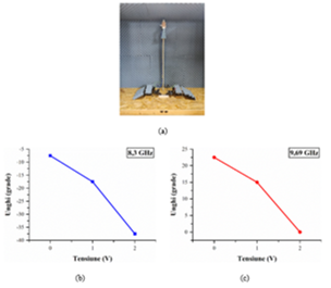 Figure 8. (a) Setup for the microwave characterization of the final demonstrator; (b) normalized power at (b) 8.3 GHz and (c) 9.69 GHz, as a function of the rotation angle and of the applied DC bias voltage. |