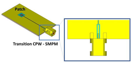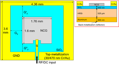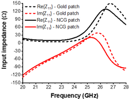 - the NCG based patch antenna, with operating frequency in the ISM 24 GHz band, will be manufactured in coplanar waveguide (CPW) technology for on-wafer measurements using standard measuring probe tips. The metal contacts will be made of gold, with a thickness of about 500 nm.