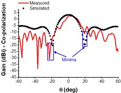 Measured (solid red curves) and simulated (dotted black curves) gain in the H-plane for both co-polarization unbiased NCG based antenna array |