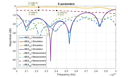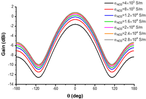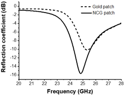 1) The antenna simulation was performed with a 3D electromagnetic simulator - CST Microwave Studio® using the optimal antenna parameters to obtain good results in terms of reflection loss and gain. Coplanar line technology (CPW) was used with an HRSi substrate covered with a thin dielectric layer of SiO2 and the antenna patch is made of a thin layer of NGC, the coplanar lines are made of gold and a thin layer was deposited on the back of the plate. aluminum as a reflective plane. The dimensions of the CPW line (50 impedance) are compatible with the CPW sample measurement system with a pitch of 150 μm. The simulation results show that the antenna has a very good reflection, a resonance in the 24-25 GHz band and a radiation efficiency of 31% with a gain of 0.3 dBi, a very good result since the single-layer graphene antennas have a low radiation efficiency. of only 2-3% and therefore a low gain with negative values. The results were obtained from the NCG conductivity measurement which was 16000 S / m. We find a variation of the gain between -1.62 dBi and 0.85 dBi, while the resonant frequency varies by 130 MHz. A linear array of the 8-element antennas was electromagnetically simulated, given that the gain increases in direct proportion to the number of antennas. The simulations were performed under the following conditions: the antenna area was designed in free space and on a 9 mm Plexiglas support under the HRSi substrate (used for measurements). The results of the simulations show that the array 8 elements NCG antennas has similar performances with an area with the same number of gold antennas, but the radiation efficiency is lower in the case of NCG.