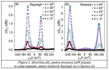 Cuplajul undelor de spin cu unda acustica SAW este evidentiat prin descresterea amplitudinii parametrilor de transmisie (S21, S12) (dB), denumita absorbtie, datorata transferului de energie de la unda SAW catre undele de spin. Acest cuplaj este maxim atunci cand unghiul dintre campul magnentic aplicat si directia de propagare a undei SAW este de 45°. In figura 3 se observa ca maximul absorbtiei in camp magnetic apare la -90mT pentru Rayleigh si are valoarea de 2,54dB. Pentru modul Sezawa maximul de absorbtie apare la un camp magnetic de -203mT si are o valoare de 7,24dB.