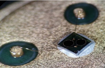 Obiectivul central al proiectului SOLARSiC a fost proiectarea, fabricarea si testarea unor fotodetectori pe SiC pentru domeniul UV. In urma optimizarii tehnologiei de fabricare a structurilor de test s-a ajuns la concluzia ca fotodetectorul UV trebuie sa aiba la baza o dioda Schottky (structura verticala) cu un electrod de poarta (anod) transparent (ITO) tratat la o temperatura moderata (400°C) si un contact ohmic (catod) format dintr-un sandwich metalic Ti/Ni tratat la o temperatura ridicata (1050°C, 3 min, atmosfera de Ar). Astfel, raspunsul fotodetectorului UV, respectiv performantele sale electrice sunt semnificativ mai bune dupa aplicarea tratamentelor termice, asigurand pe de o parte o mai buna omogenitate a contactului, iar pe de alta parte un fotoraspuns la lumina UV de 3 ordine de marime si timpi de reactie foarte mici ( <1s). Pentru testarea si validarea in conditii de laborator ale structurilor de test, acestea au fost incapsulate utilizand tehnologia firului de aur, un exemplu fiind prezentat in Fig. 1.