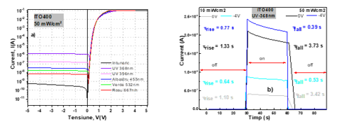 Fotodetectorii au fost testati electric la mai multe lungimi de unda din domeniul UV + vizibil, cu accent pe domeniul UV (368, 396 nm), atat in regim static (caracteristici I-V), cat si in regim dinamic (caracteristici I-t, la V = const.). De asemenea, au fost aplicate doua densitati de putere a intensitatii luminoase (10 mW∕cm2, respectiv 50 mW∕cm2). Performantele fotodetectorilor fabricati pe SiC au fost validate in conditii de laborator prezentand o crestere cu 3 ordine de marime a curentului si un timp de raspuns in regim dinamic mai mic de 1s (Fig. 2).