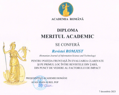 Romanian Journal of Information Science and Technology (ROMJIST) was awarded in 2023 with the "Diploma of Academic Merit of the Romanian Academy", for the leading position in the Clarivate evaluation and first place among the journals in Romania, from the point of view of the impact factor.